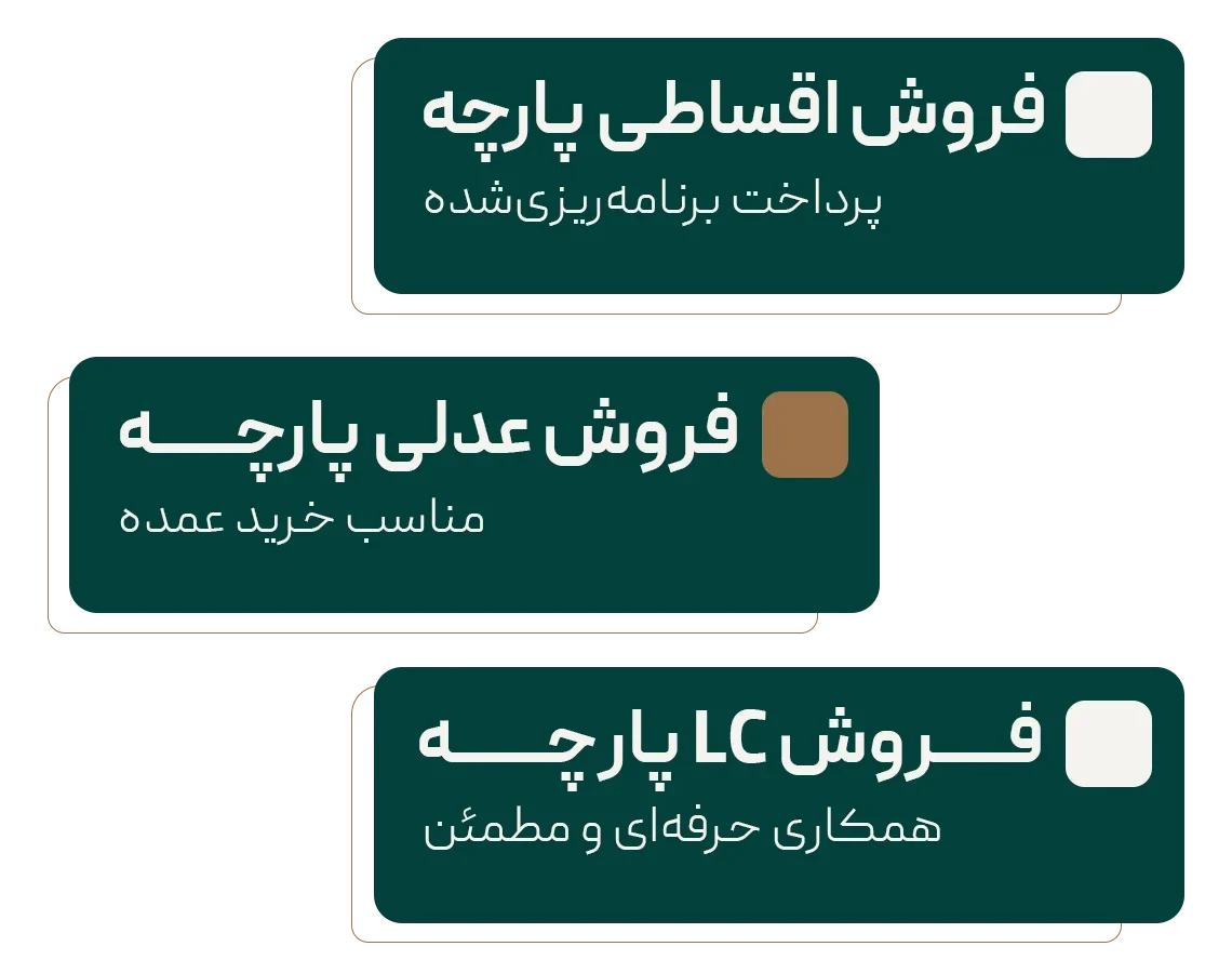 برای تسهیل خرید و مدیریت بهتر نقدینگی، مجموعه ما امکان فروش اقساطی پارچه، فروش عدلی پارچه و فروش LC پارچه را برای همکاران و خریداران عمده فراهم کرده است.